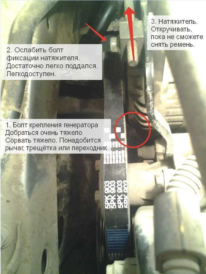 - При помощи натяжителя ремня, сместите натяжитель в сторону, чтобы ослабить натяжение и снять ремень гур с соответствующих шкивов.